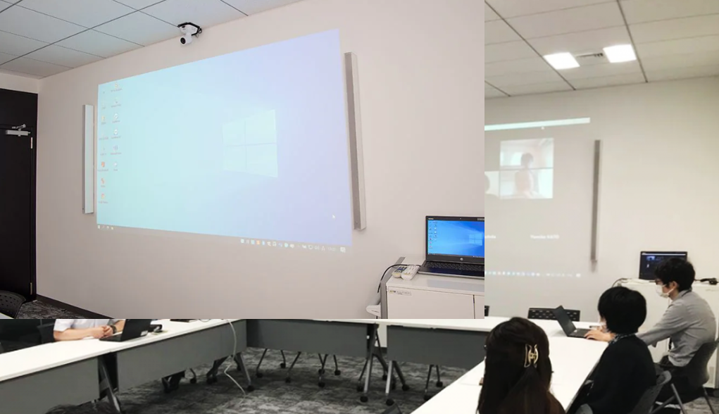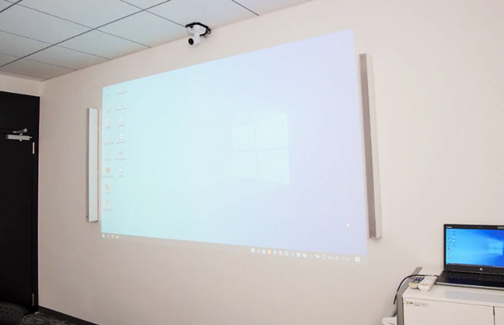 ○ RM-CG(천장 마이크) 2ea, VXL1- 16P(단테 스피커), RM-CR(DSP) 1ea의 설치 전경입니다.