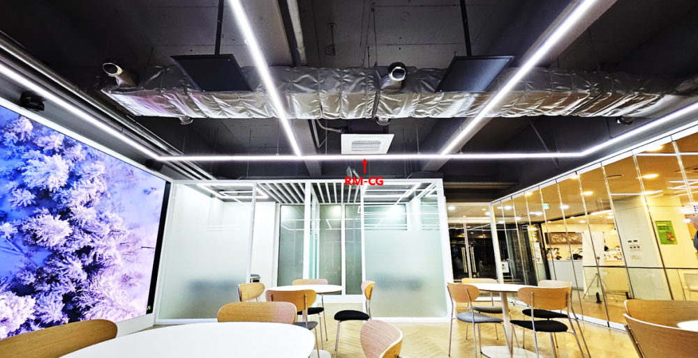 ○ 천장 인테리어 마감을 하지 않고 모든 설비 장비 전체가 노출된 오픈 천장이라 매립 대신 VESA Mount 방식으로 설치하였습니다.