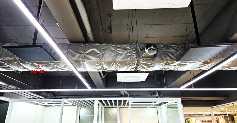 ○ 천장 인테리어 마감을 하지 않고 모든 설비 장비 전체가 노출된 오픈 천장이라 매립 대신 VESA Mount 방식으로 설치하였습니다.